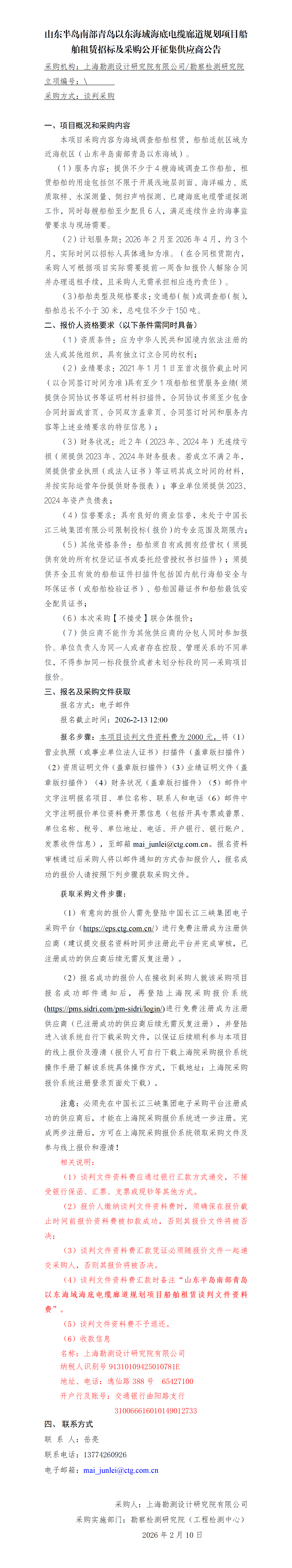 山東半島南部青島以東海域海底電纜廊道規(guī)劃項目船舶租賃